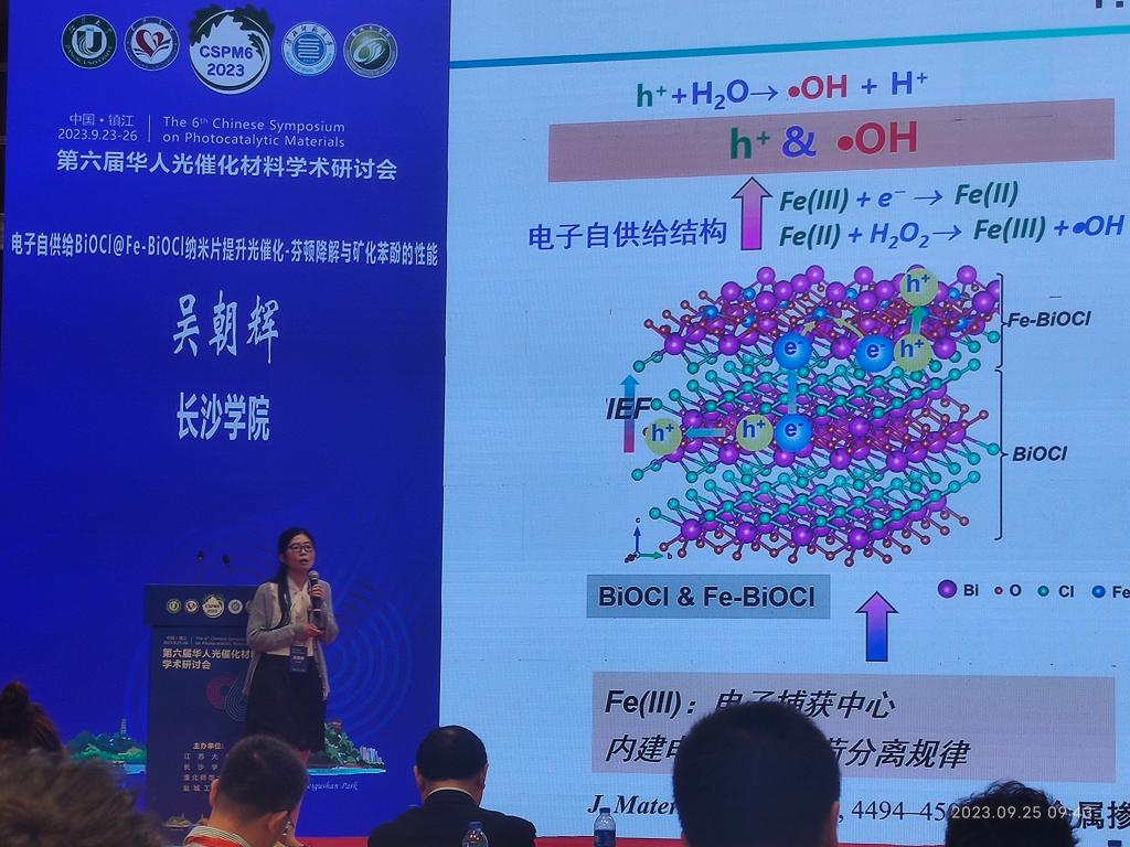 2023年9月23-26日,由江苏大学、长沙学院、淮北师范大学和盐城工学院联合主办的“第六届华人光催化材料学术研讨会(CSPM6)”在江苏镇江召开。材料与环境工程学院、环境与能源光催化协同创新中心派出老师和研究生共9人参加了本次学术研讨会,吴朝晖博士受邀作《电子自供给BiOCl@Fe-BiOCl纳米片提升光催化-芬顿降解与矿化苯酚的性能》口头报告。我校作为会议联合主办单位,四次受邀并成功举办会议,分别是第二届(南京,2019)、第三届(武汉,2020)、第五届(武汉,2023)和第六届(镇江,2023),在光催化研究领域的学术影响力得到了持续提升。