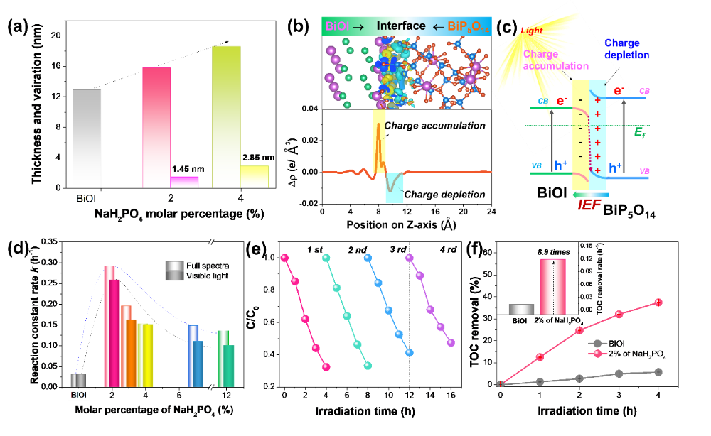 在BiOI表面外延生长单原子层BiP5O14(BiOI/BiP5O14),可获得较强的界面内建电场。增强的界面内建电场能有效驱动载流子定向迁移与有效分离,提升光催化降解苯酚的活性与矿化能力。(Appl. Catal. B: Environ., 2022, 307, 121153.)