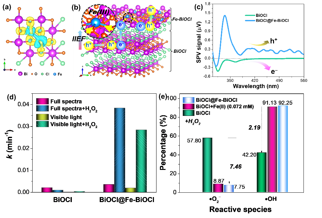 构建BiOCl@Fe-BiOCl电子自供给核壳结构纳米片,用于光催化-芬顿体系降解苯酚。在该光催化-芬顿体系中,h+在催化剂表面富集,固载化的Fe(III)通过捕获e-和芬顿反应实现Fe(III)/Fe(II)循环,选择性转化的活性物种·OH与h+协同作用,提升光催化-芬顿降解苯酚的活性和矿化性能。(Appl. Catal. B: Environ., 2023, 330, 122642.)
