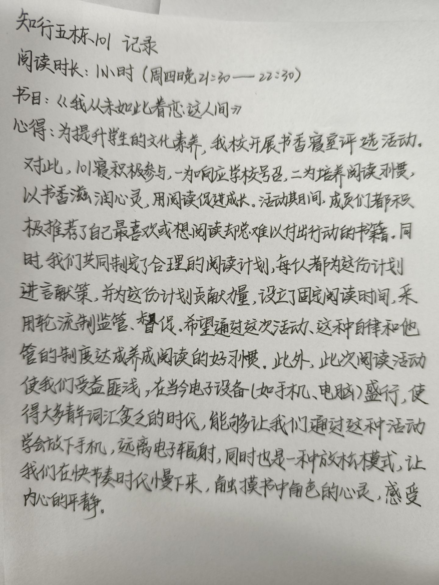 “这本书的主角让我想到我们之前遇到的难题……”“这个理论如果用在实际生活中,或许可以这样尝试……”活动中,知行五栋101同学们不仅埋头阅读,更主动分享心得:从文学人物的命运起伏聊到现实成长的困惑,从科学理论的精妙推演延伸到专业学习的启发。一篇科幻小说激发出跨学科的辩论,一本《我从未如此眷恋这人间》触动了室友间的共鸣,不同视角的碰撞让简单的阅读延伸为一场场小型“思享会”。洪山一栋142分享的阅读书目是《红星照耀中国》。“我们寝室约好每晚熄灯前半小时一起看书,没想到大家越聊越投入,最后差点忘了时间!”参与活动的谭同学笑着说。书香悄然拉近了室友的距离:有人为情节跌宕的小说红了眼眶,身旁的室友默默递上纸巾;有人读到精彩段落忍不住朗诵,瞬间引发全寝室的掌声。