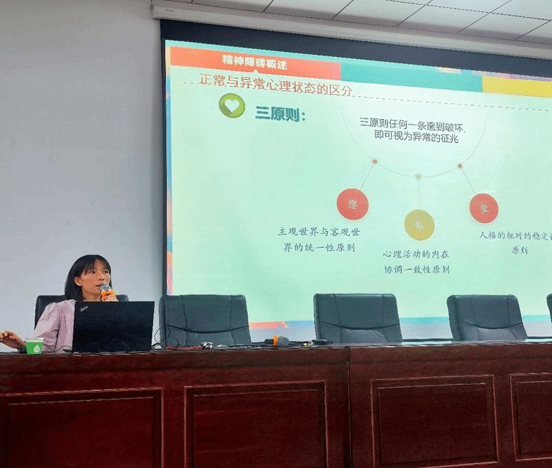 段思岚老师首先围绕“大学生常见心理疾病”、“心理疾病成因与危害”及“朋辈心理危机干预措施”三个方面为同学们进行全方位讲解。随后,段思岚老师详细地分析了大学生常见的精神障碍类型,并利用一些心理小测试来帮助学生们完成自我心理检测,让同学们对自身心理健康状态有更清晰的认识。最后,段思岚老师呼吁同学们要时刻关注和防治心理健康问题,多关注身边的同学、朋友和家人,发现心理问题应及时寻求帮助。