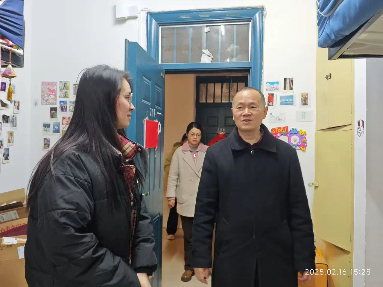 为精准掌握学生假期返校动态,学院党总支书记钟继军和党总支副书记刘敏带领全体辅导员深入学生宿舍,关心学生所需,开展安全检查。在检查过程中,师生进行深入交流,如问询假期见闻收获、解析学业规划进展、了解生活困难、掌握思想波动情况等,叮嘱学生要调整身心状态、提升安全意识,同时对宿舍卫生和安全用电提出新的要求。